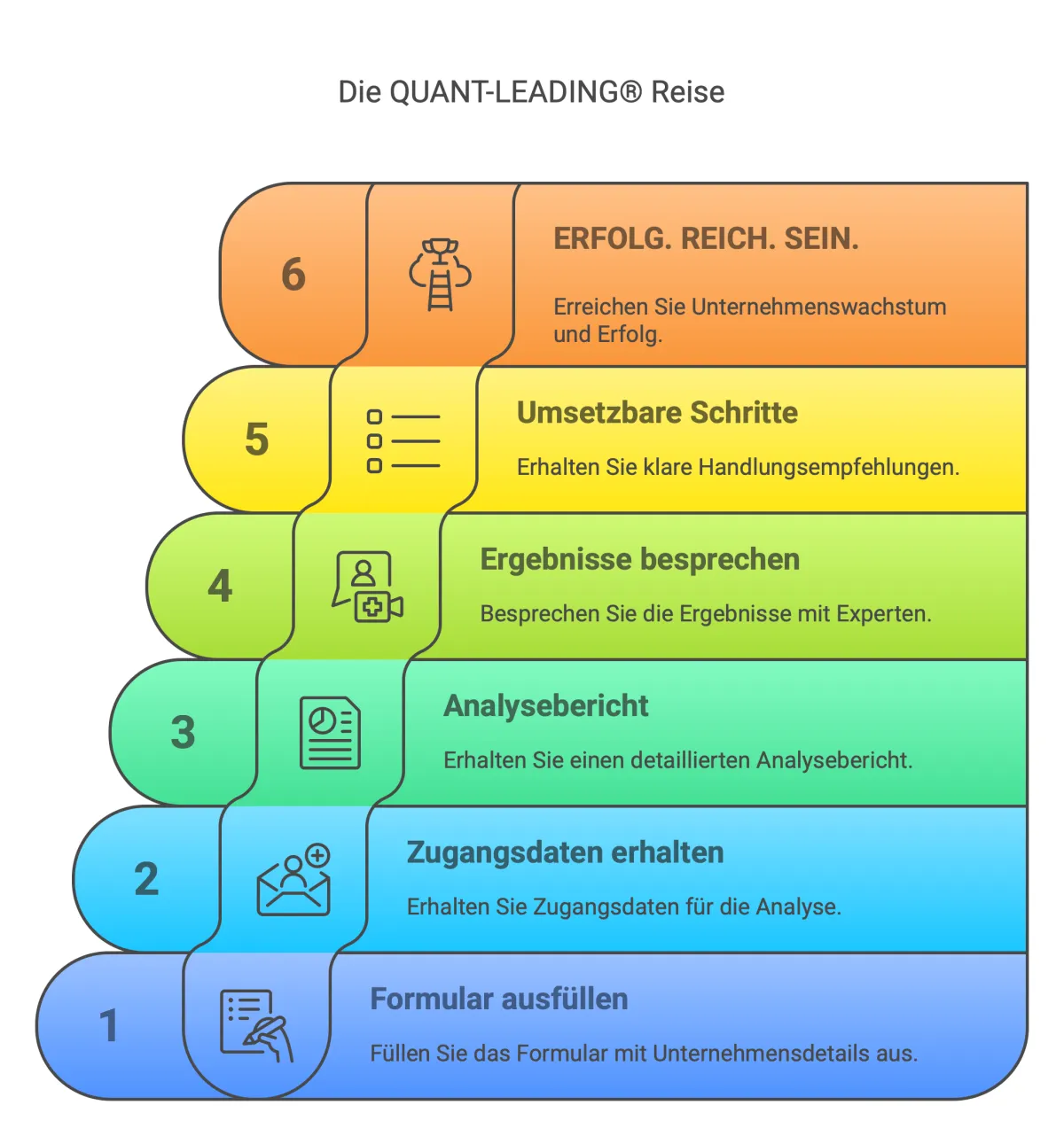 Bist Du bereit, Dein Unternehmen mit neuer Energie, Klarheit und Begeisterung zu füllen? Warte nicht länger darauf, dass sich Probleme von selbst lösen. Gehe den ersten Schritt zu bewusster Führung und langfristigem Erfolg – und das ohne Risiko und ohne Kosten. Sichere Dir jetzt Deine kostenlose QUANT-Modell® Unternehmensanalyse und lege den Grundstein für „Management mit Freude und Leichtigkeit".